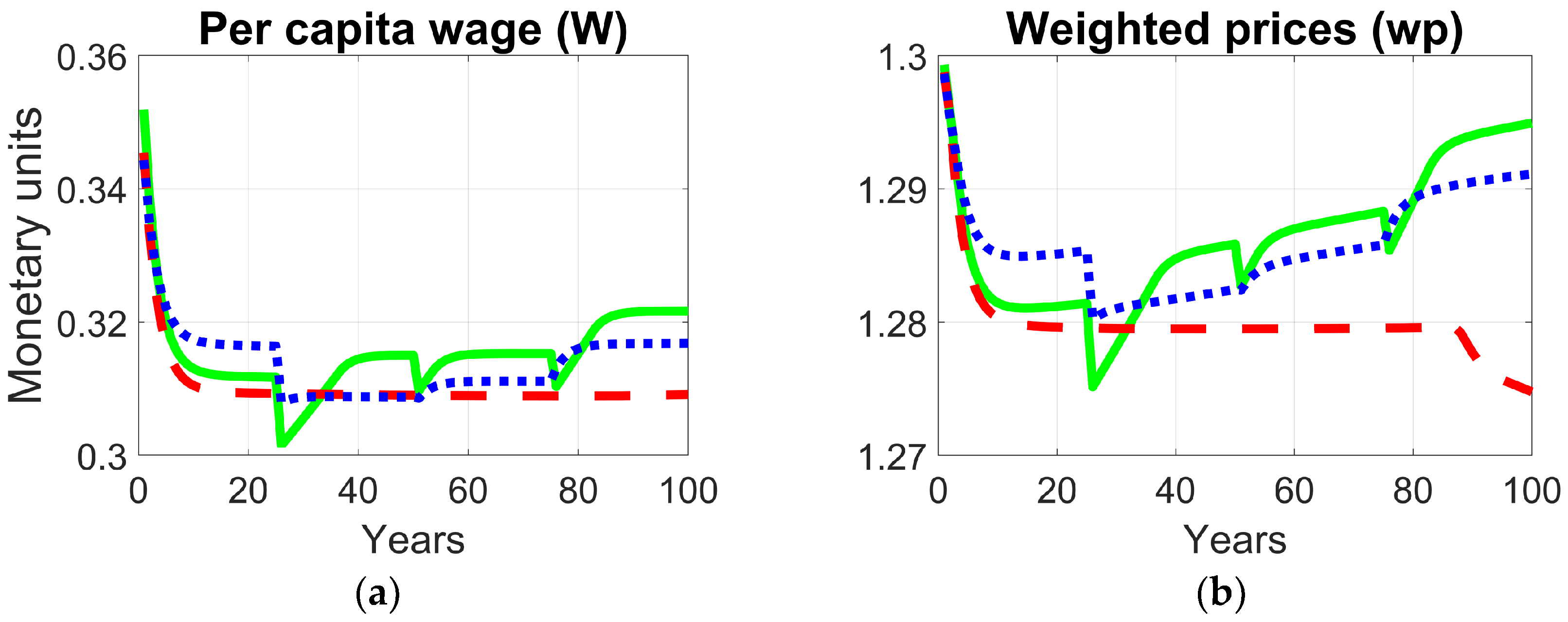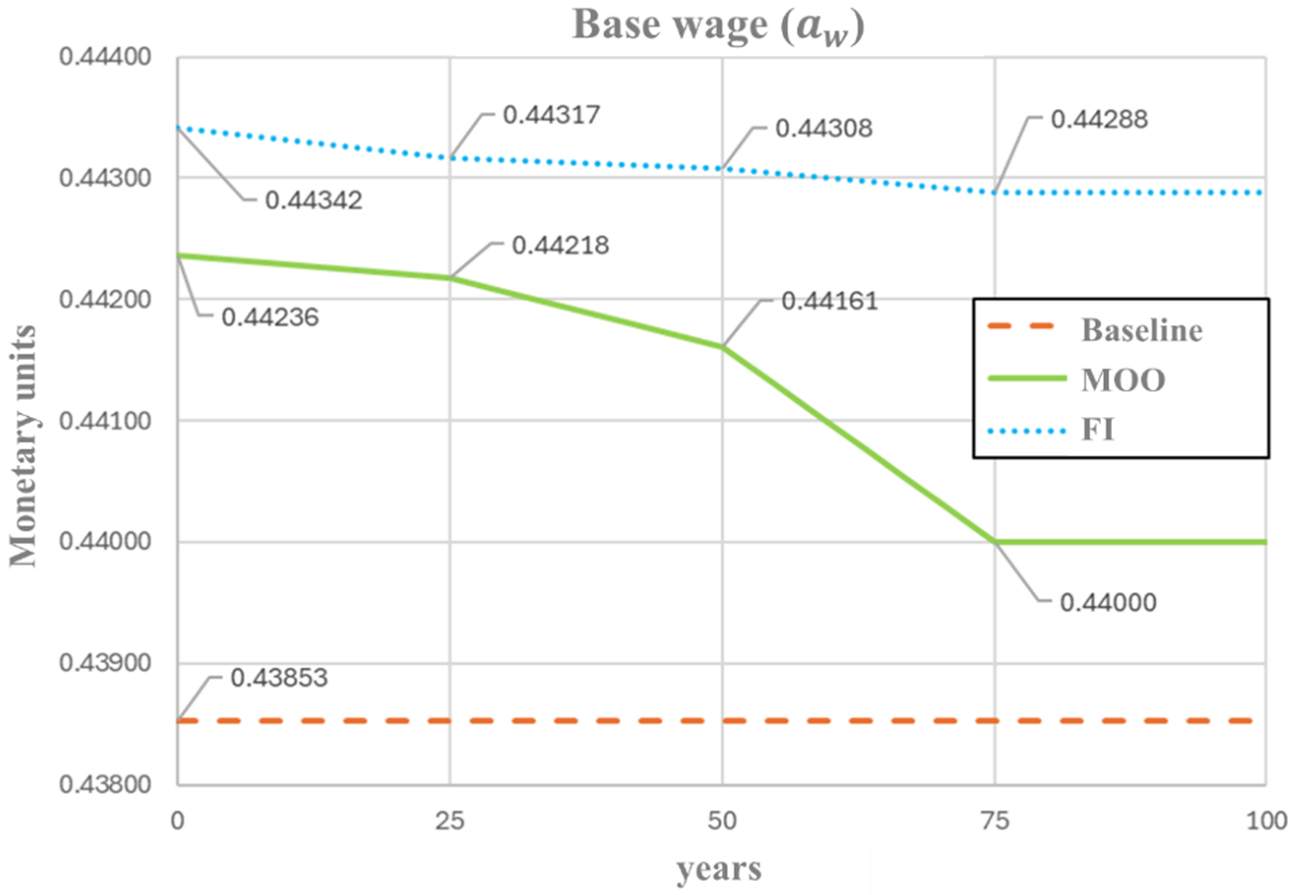 - Base wage (): Represents the income level of the human compartment, directly linked to labor legislation, such as minimum wage laws and social protection mechanisms. Adjustments to this variable allow the model to emulate the effects of income redistribution and wage reform on social well-being and consumption patterns.
