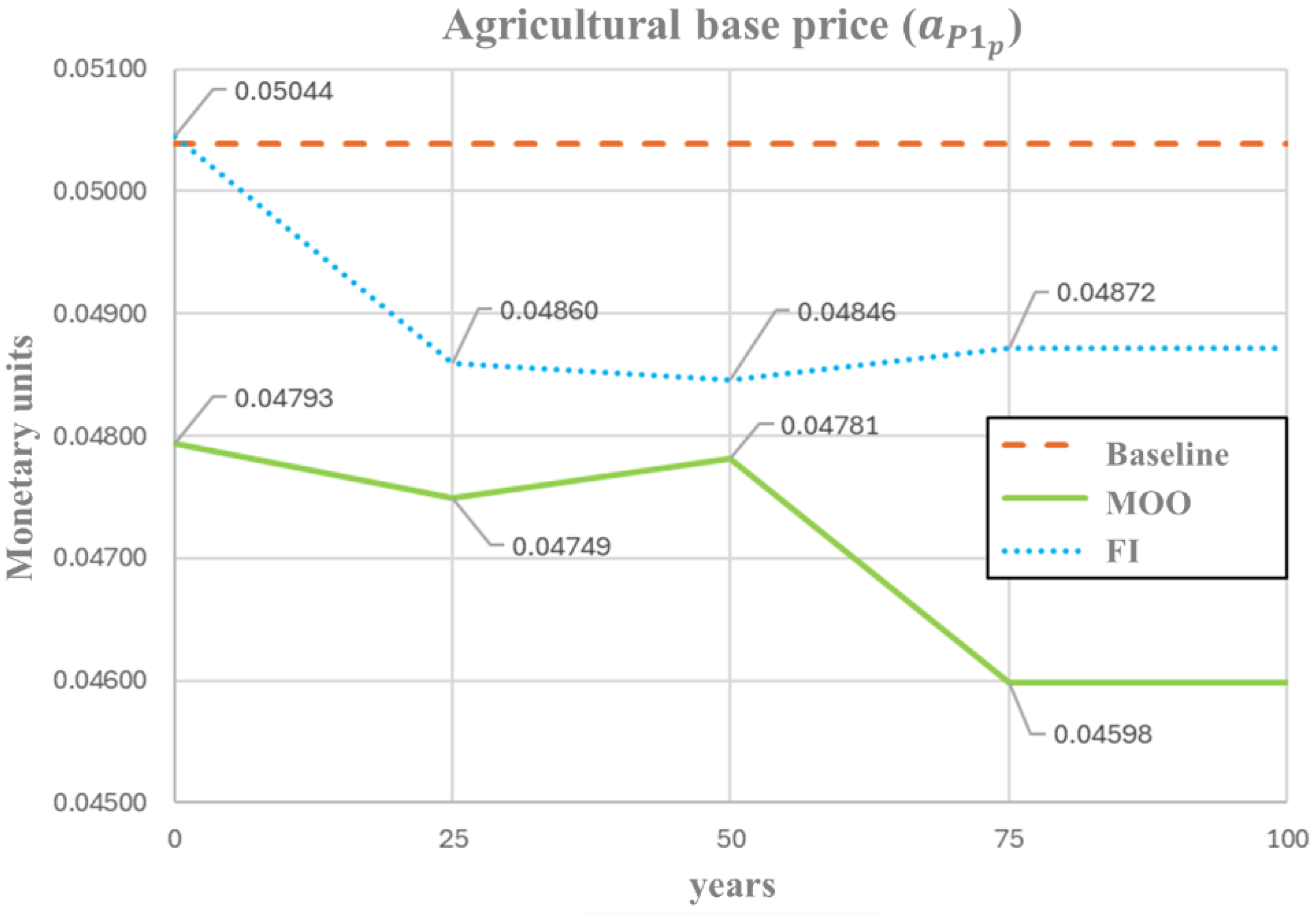 - Prices of agricultural plants (): Corresponds to the market price or subsidy structure of food crops. It captures the effect of agricultural price policies or fiscal incentives aimed at stabilizing food production, ensuring profitability, and promoting sustainable farming practices.