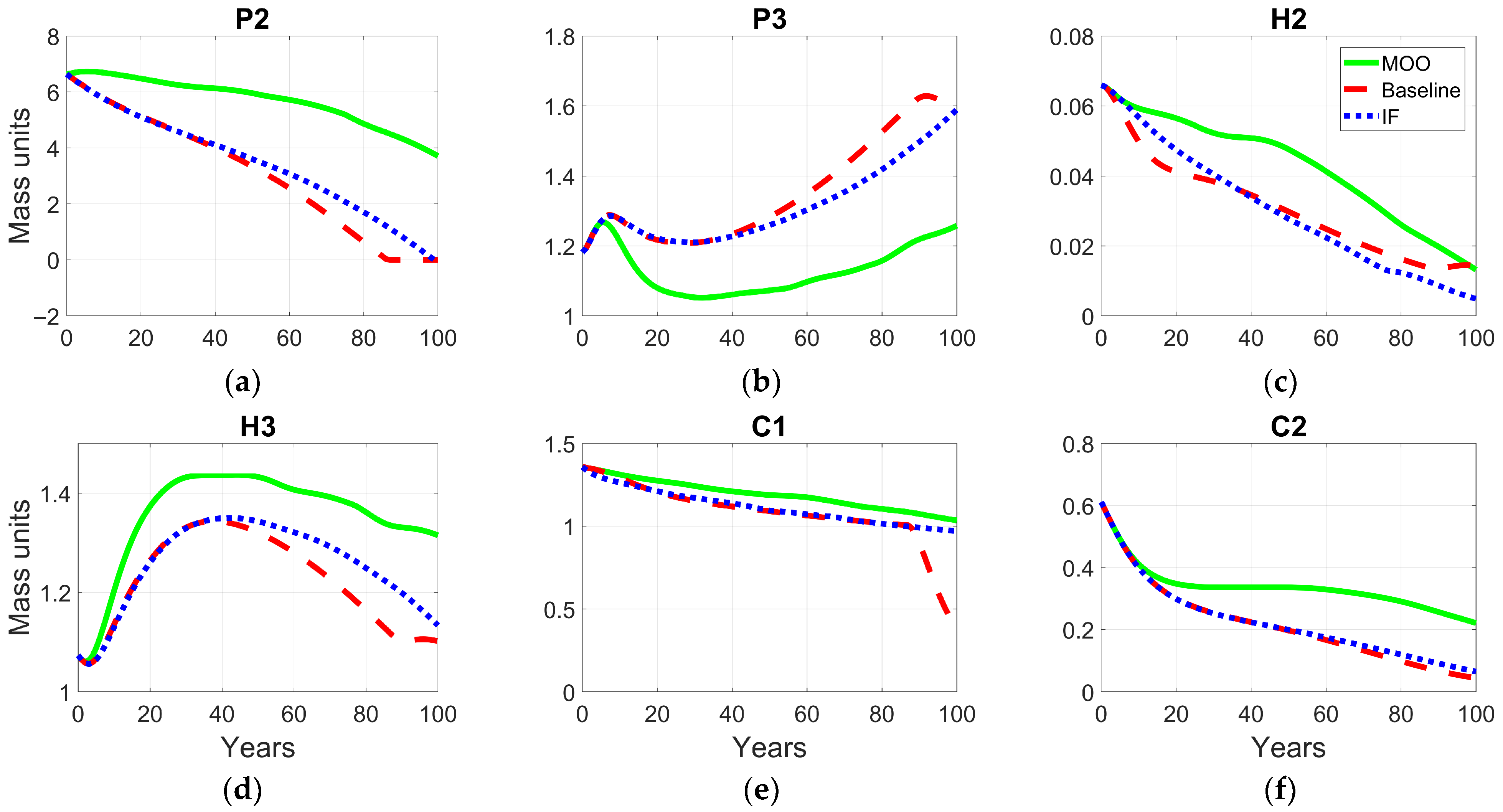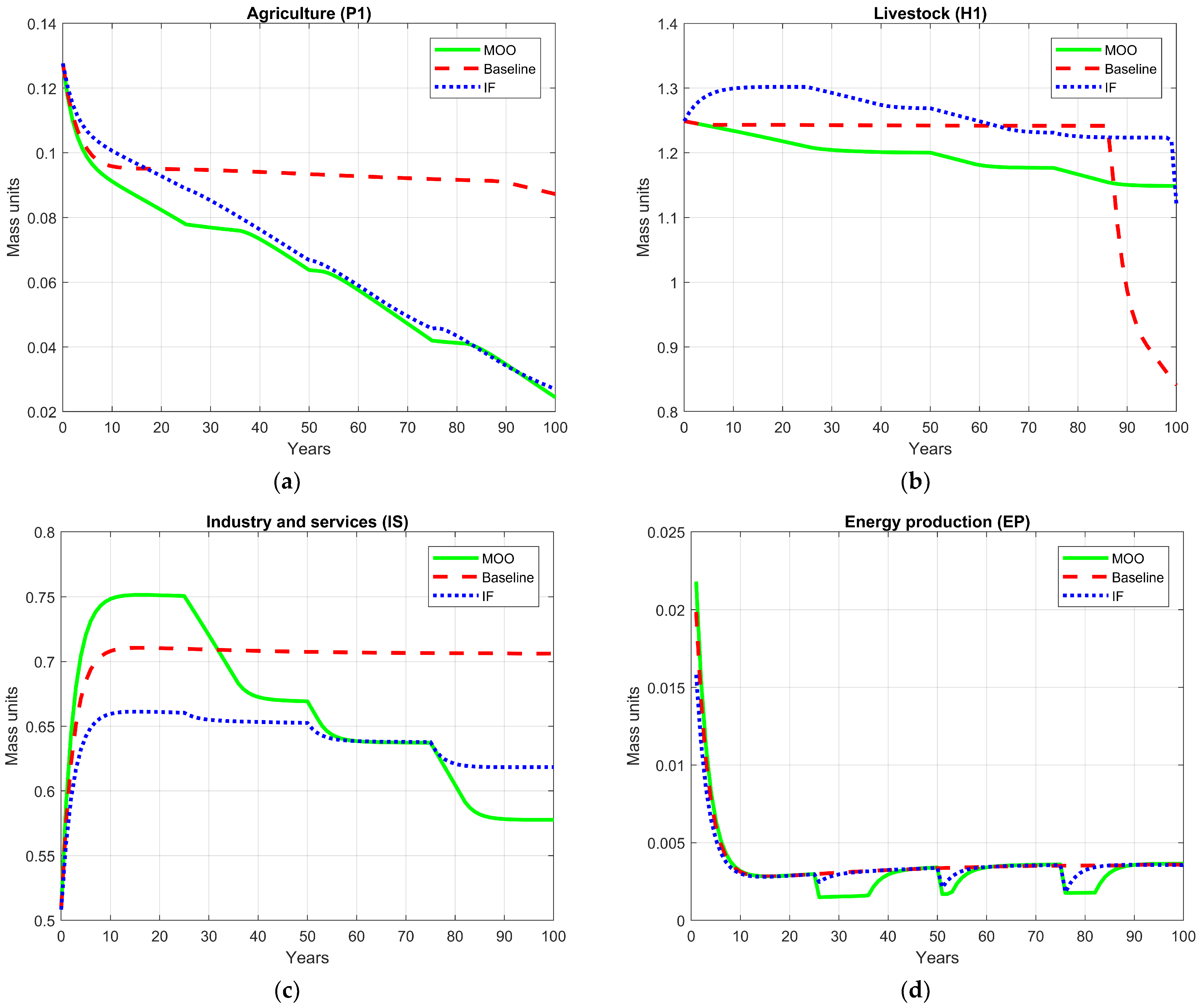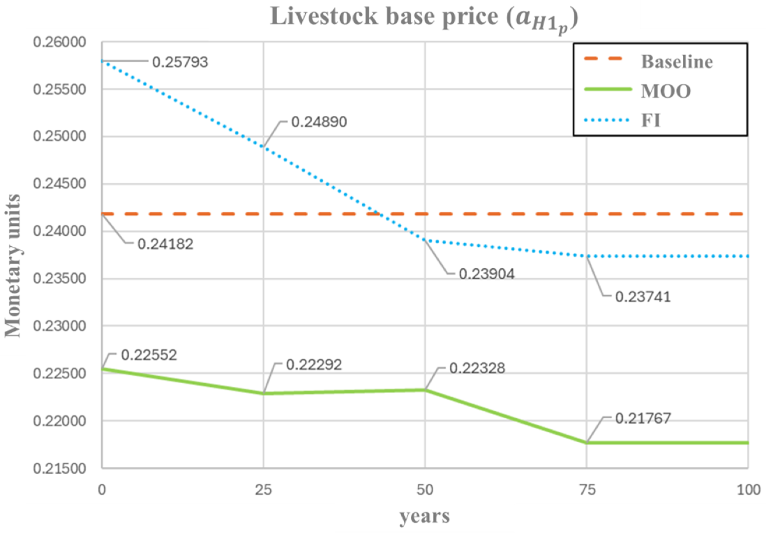 - Prices of livestock herbivores (): analogous to the agricultural case but applied to the livestock sector, this variable represents pricing or subsidy mechanisms that can regulate the intensity of animal production and its associated environmental impact.