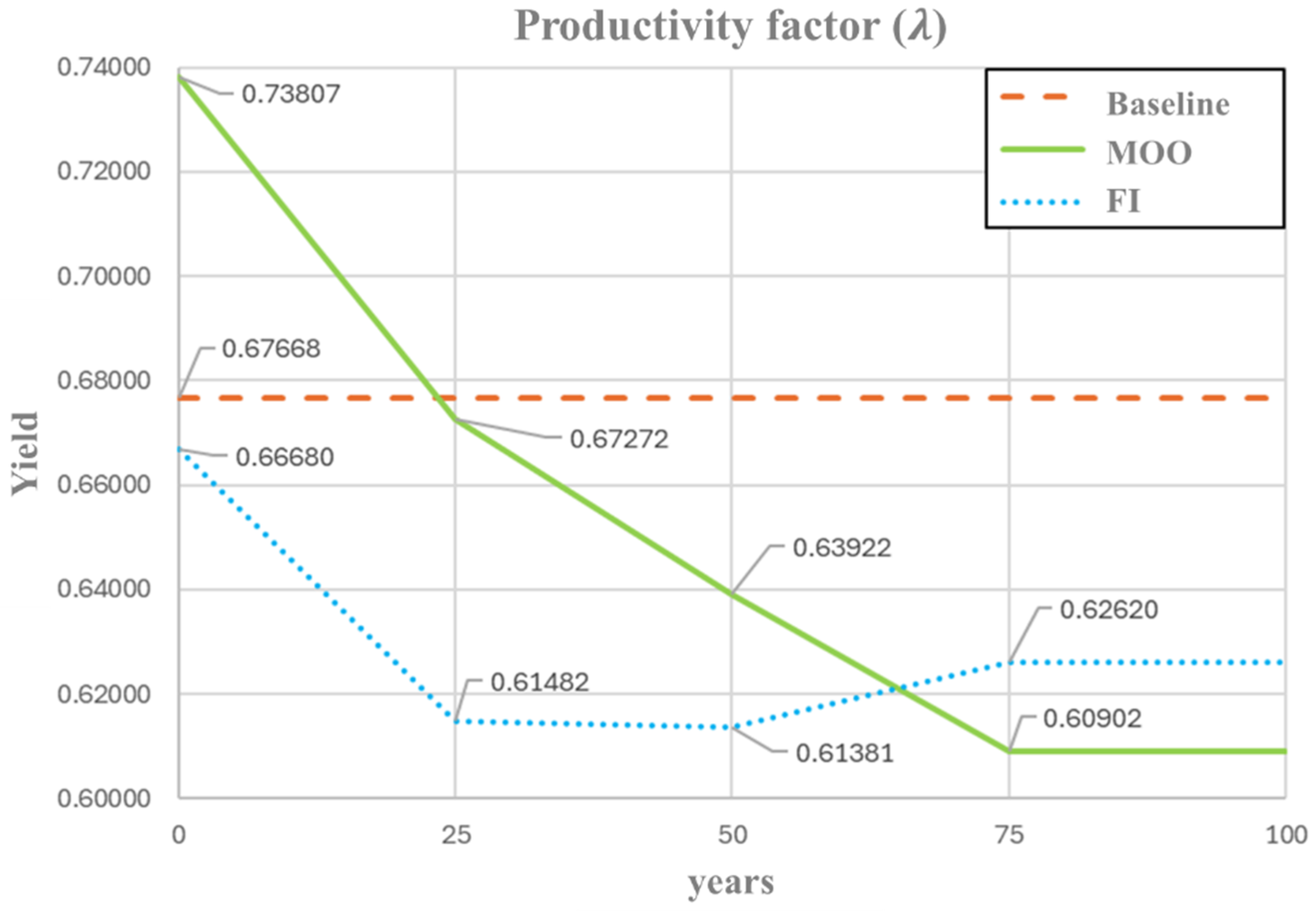- Resource productivity factor (): Represents the efficiency of biotic and abiotic resource use, encompassing technological innovation, circular economy measures, and policies promoting sustainable production. In practice, it can be improved through technological modernization programs and public investment in resource efficiency initiatives.