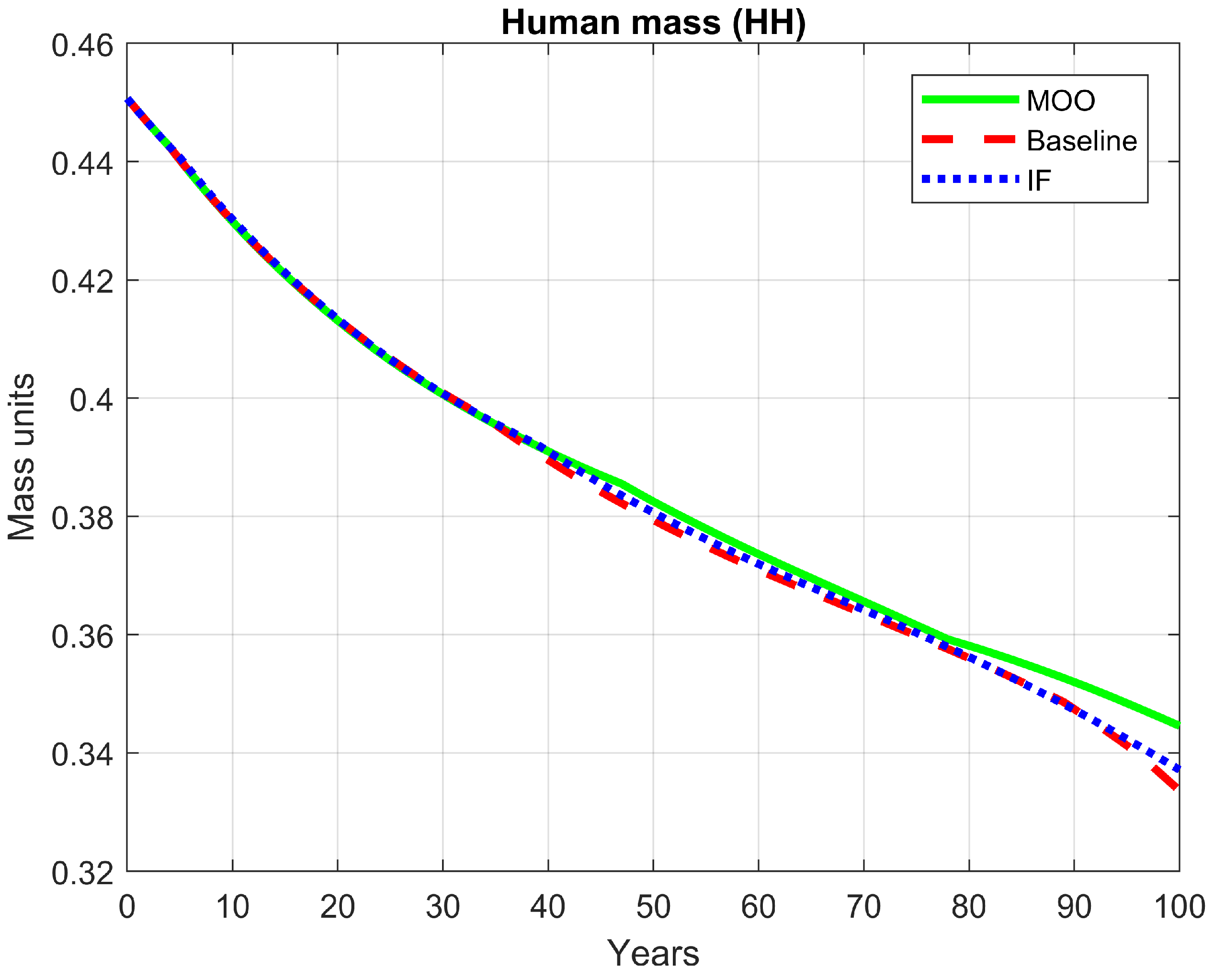 - Humans: HH, representing total human biomass, linked to the human population (NHH) through per-capita mass.