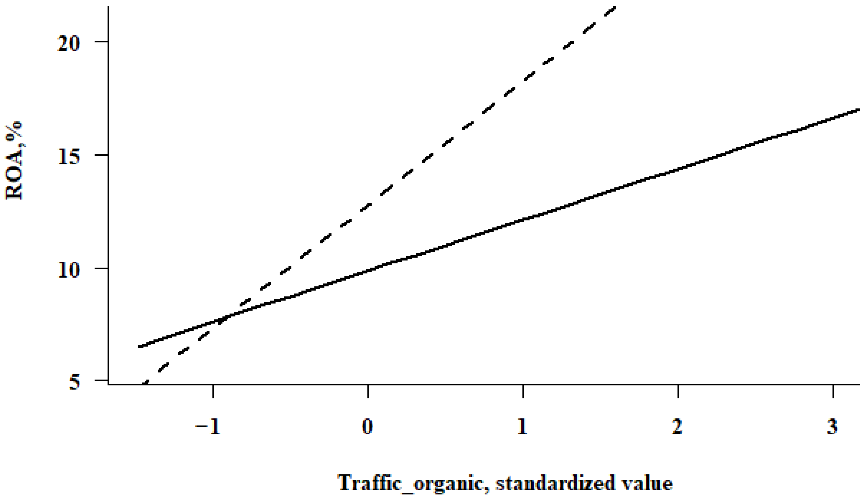 The variables size, FATA, leverage, and dummy_industry (electronics supermarkets) show a negative association. The significant electronics supermarkets dummy suggests the presence of industry-specific effects, with electronics supermarkets firms differing from the baseline industry in terms of the dependent variable. This shows possible bureaucratic inefficiencies, diminishing returns to scale, financial risks, and structural challenges. The “organic traffic” (Model 2.1) shows a positive association with the firm performance (ROA). This confirms that firms with more organic traffic tend to perform better financially. Model 3.1, with firm size as a moderating variable, shows a negative association with firm performance (ROA). This indicates that the smaller firms tend to benefit more from organic traffic in terms of ROA compared to larger firms (See Figure 1). This also supports the study hypothesis 3a. The inclusion of a moderator variable (size) enhances the efficacy of our regression model in comparison to the previous iteration (Adj. R2). Figure 1 illustrates a visual representation of the influence of organic traffic on the firm performance (ROA), considering firm size as a moderating factor.
