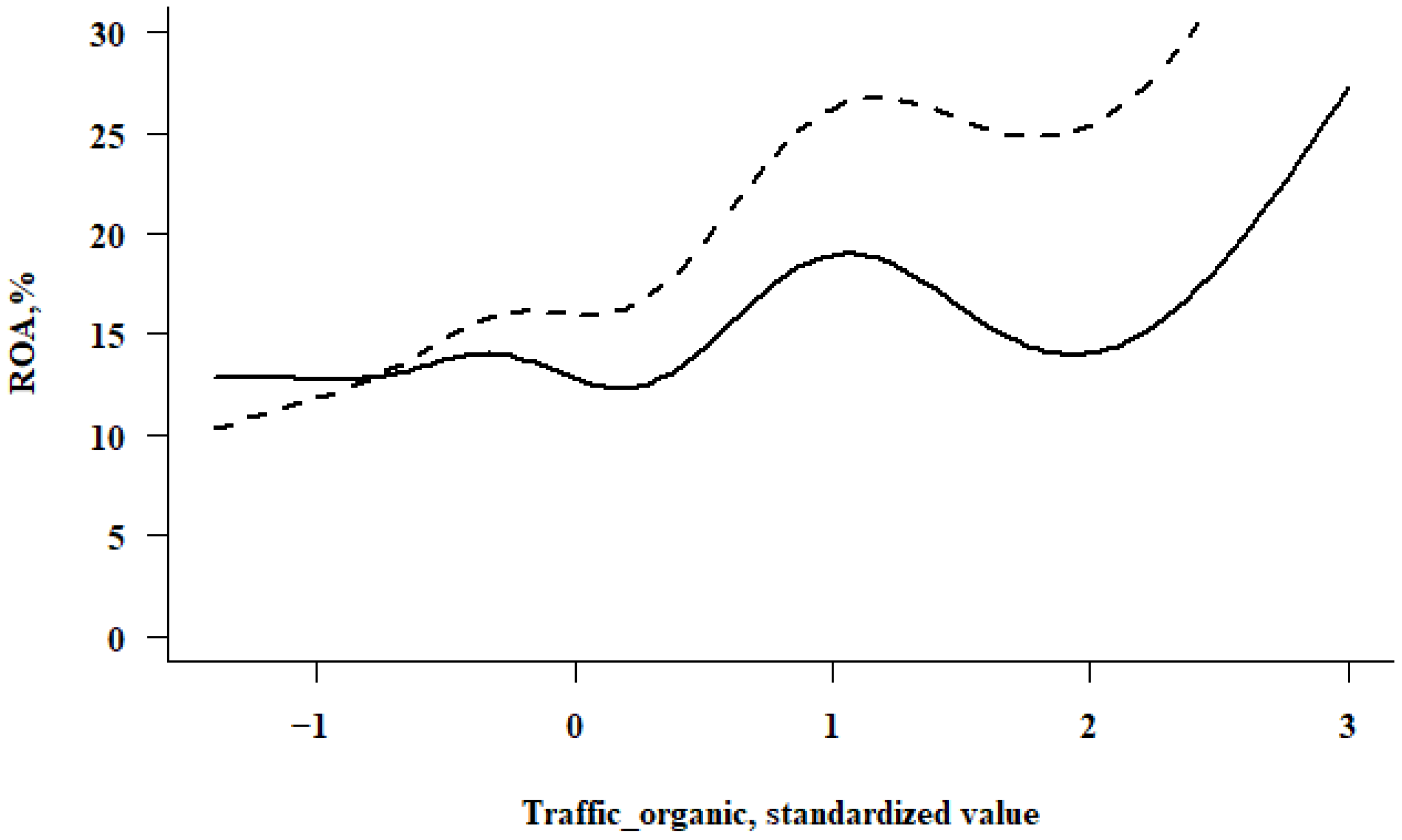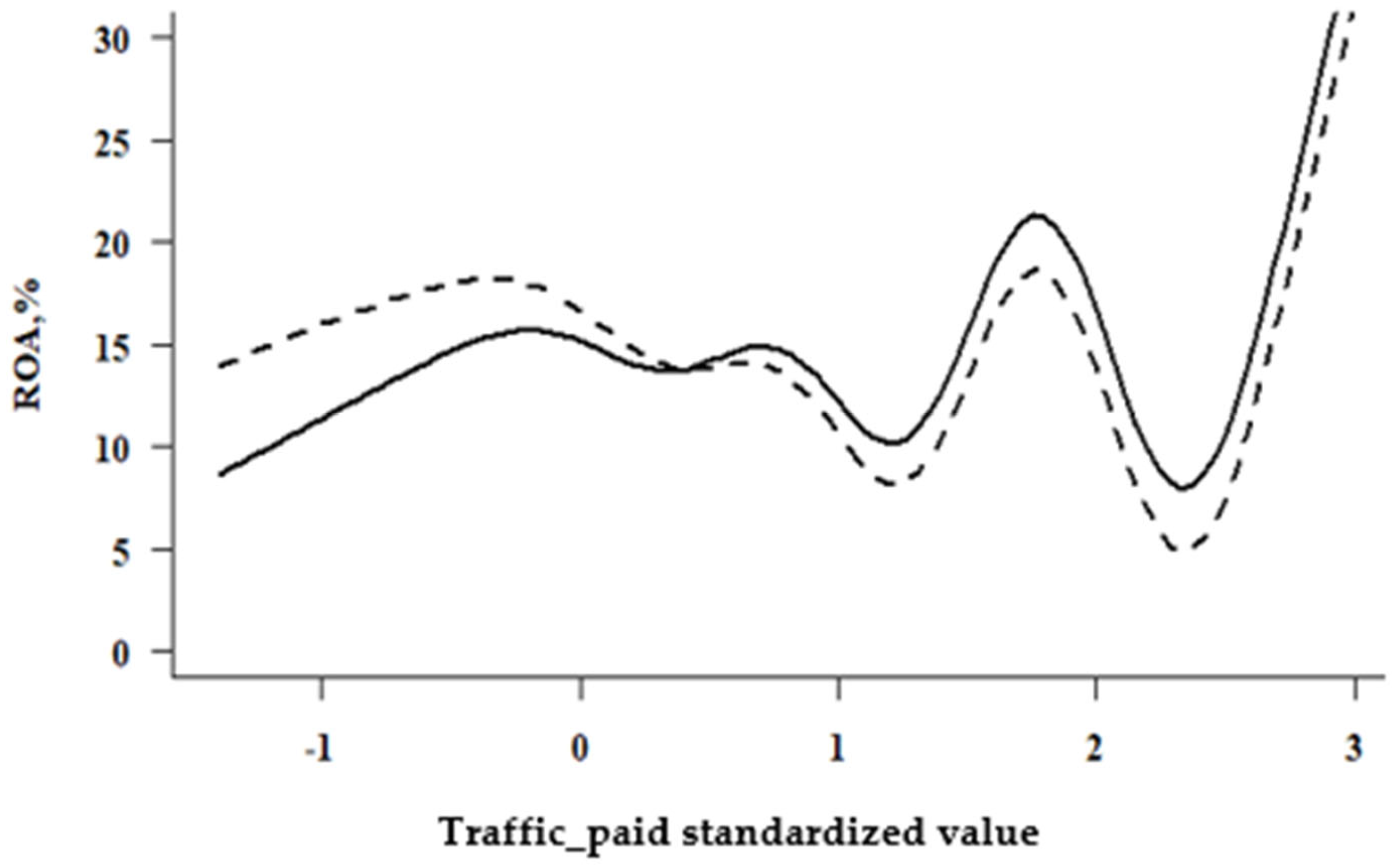 Similar interpretations can be made for Figure 4 and Figure 5. These graphs illustrate the nonlinear relationships between paid traffic and firm profitability, highlighting how the impact varies with different moderators. As illustrated in Figure 4 and Figure 5, one can interpret the effect in terms of positive or negative slopes. The diminishing returns here (paid traffic) can be interpreted as arising from rising marginal advertising costs and an audience overexposed to same advertisements, which reduce conversion efficiency beyond a certain spending level. In the case of paid traffic, the relationship with ROA shows a more complex pattern compared to organic traffic (See Figure 4 and Figure 5). Paid traffic in Russia is complex, possibly due to sanctions-driven isolation, regulatory control, data constraints, and platform concentration. Consequently, the GAM findings support study hypothesis 2b. Furthermore, the impact of paid traffic on ROA indicates a curvilinear relationship in nature. This also supports study hypothesis 1, that the impact of organic and paid traffic on firm performance differs.