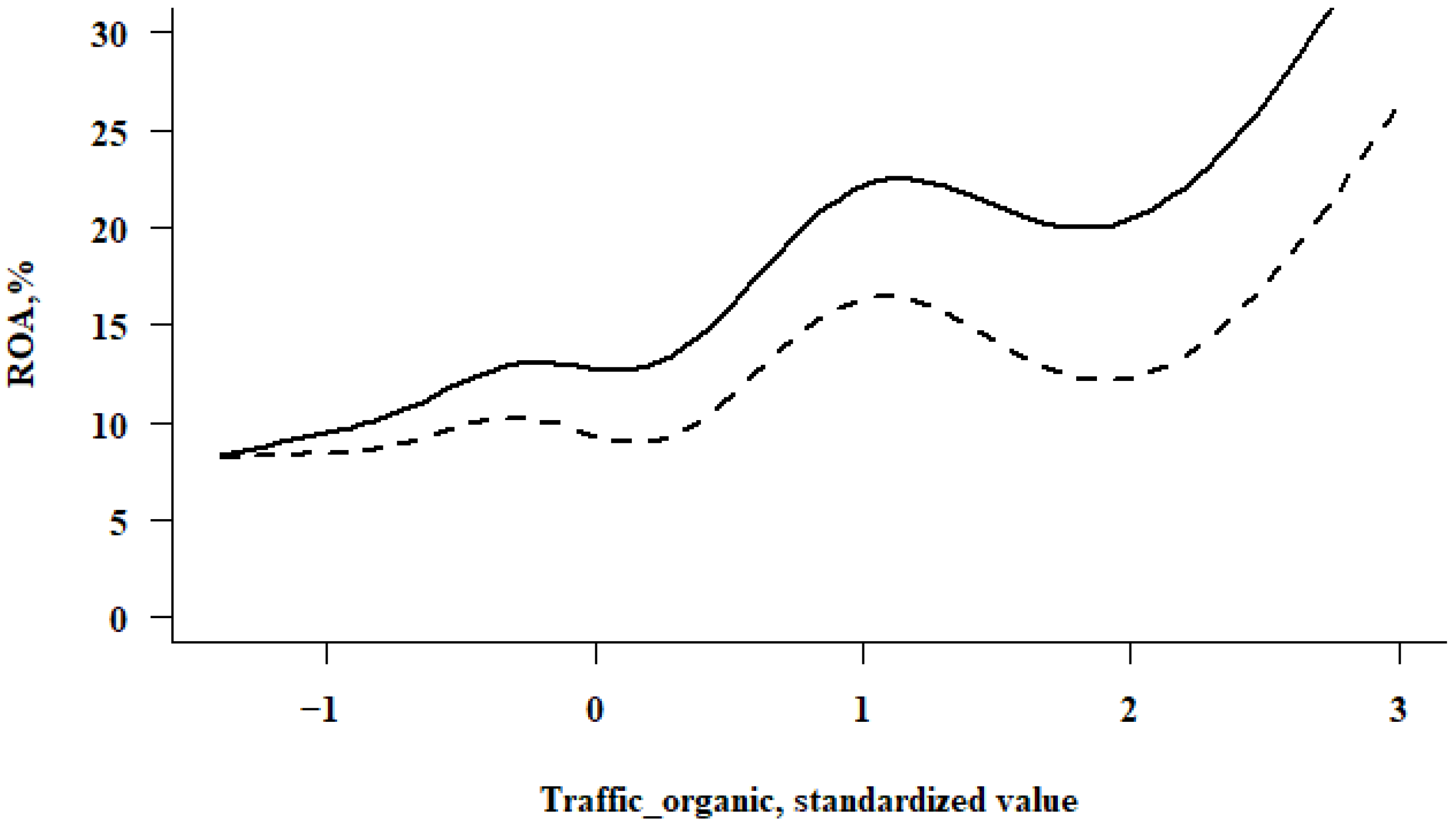 The study deploys GAMs to explore nonlinear dependencies between variables (See Table 7). GAMs provide us with an opportunity to capture the complex, nonlinear relationships that might exist, and giving us a chance to understand of how different predictors influence the outcomes. Table 7 presents the results of GAMs for Model 5.1 and Model 5.2, examining the nonlinear dependencies between various predictors and ROA. (edf) is a summary statistic of GAMs and reflects the degree of nonlinearity of a curve. Similarly, (Ref.df) is reference degrees of freedom used in computing the test statistic. The analysis shows that both organic and paid traffic have significant positive effects on ROA (edf = 6.32 for Model 5.1 and 7.78 for Model 5.2), indicating the crucial role of traffic in firm profitability.
