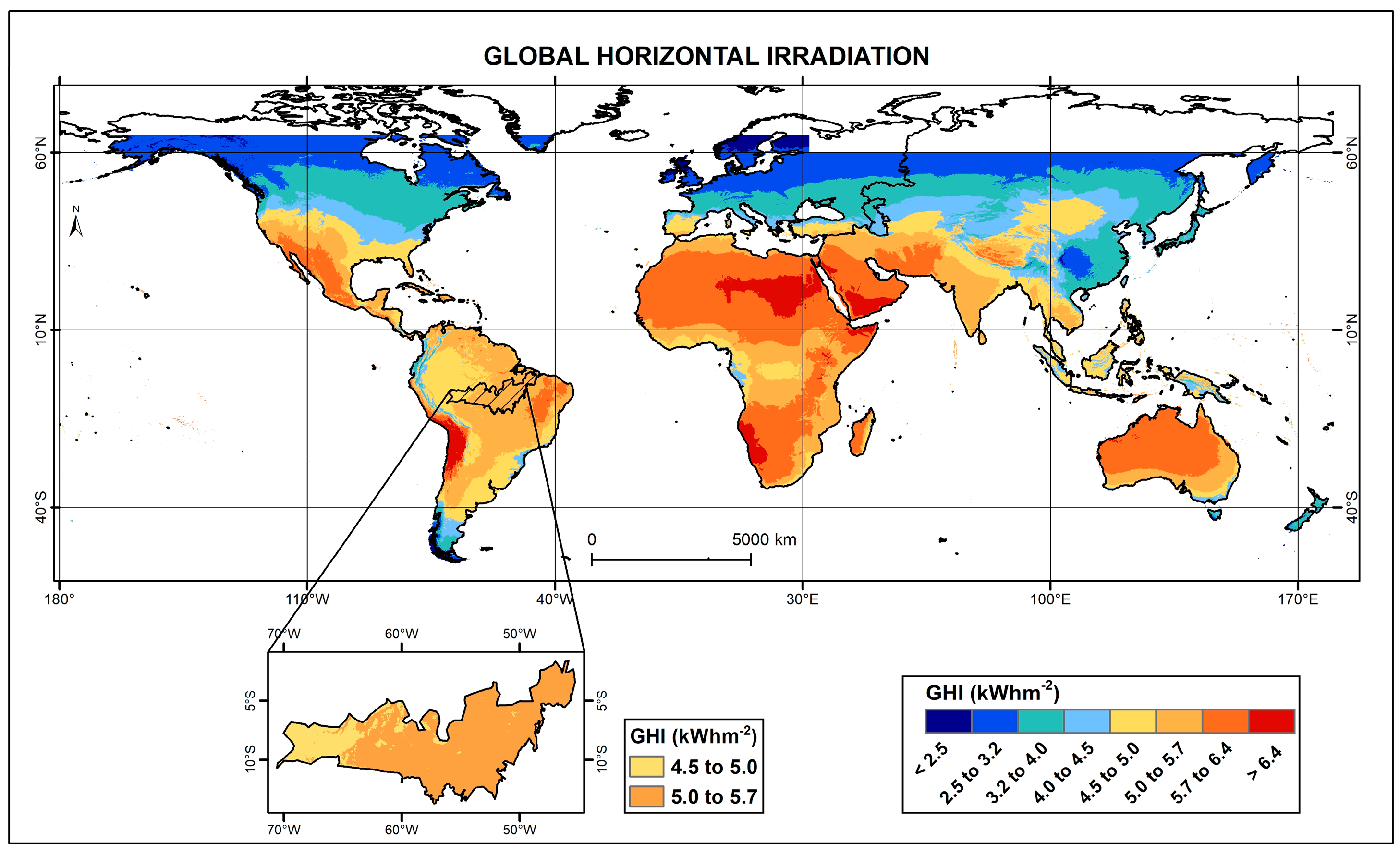 Figure 1. Global spatial distribution of mean annual Global Horizontal Irradiation (GHI, kWh·m−2·day−1) derived from the Global Solar Atlas (1999–2018) [16]. The map highlights the tropical belt as a region of high solar irradiance worldwide. In South America, elevated GHI levels are observed across large portions of Brazil. The inset map delineates the Brazilian Arc of Deforestation, where mean daily GHI values predominantly range between 4.5 and 5.7 kWh·m−2·day−1, according to the classes shown in the legend.