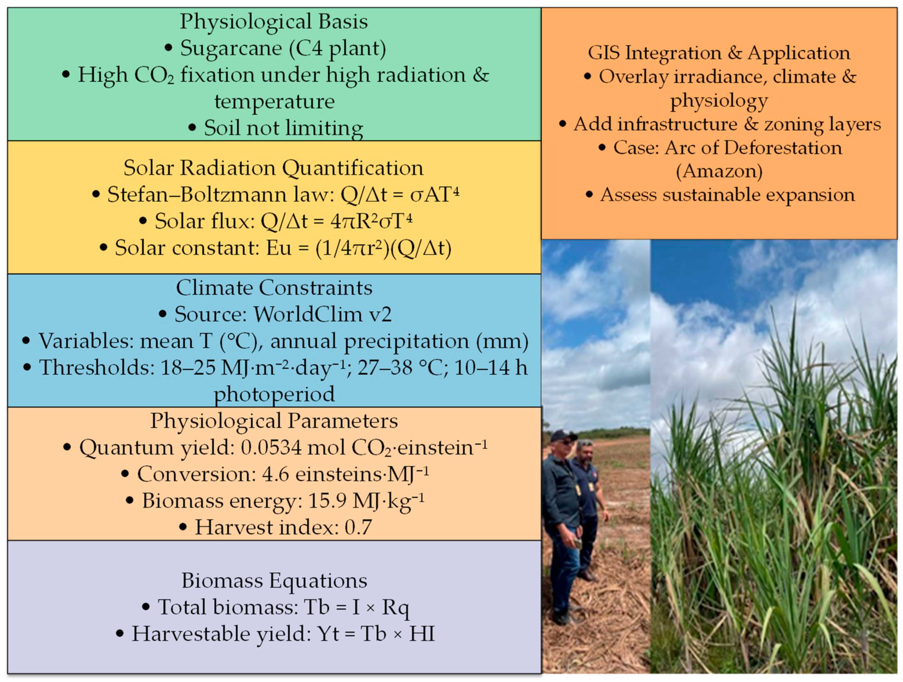 The overall methodological framework integrates fundamental physiological principles of sugarcane growth with quantitative assessment of solar radiation, agroclimatic characterization, and biomass conversion processes within a spatially explicit modeling approach. Solar irradiance was quantified using physically based formulations (Equations (1)–(3)) supported by satellite derived datasets and represents the primary driver of potential productivity in the model.