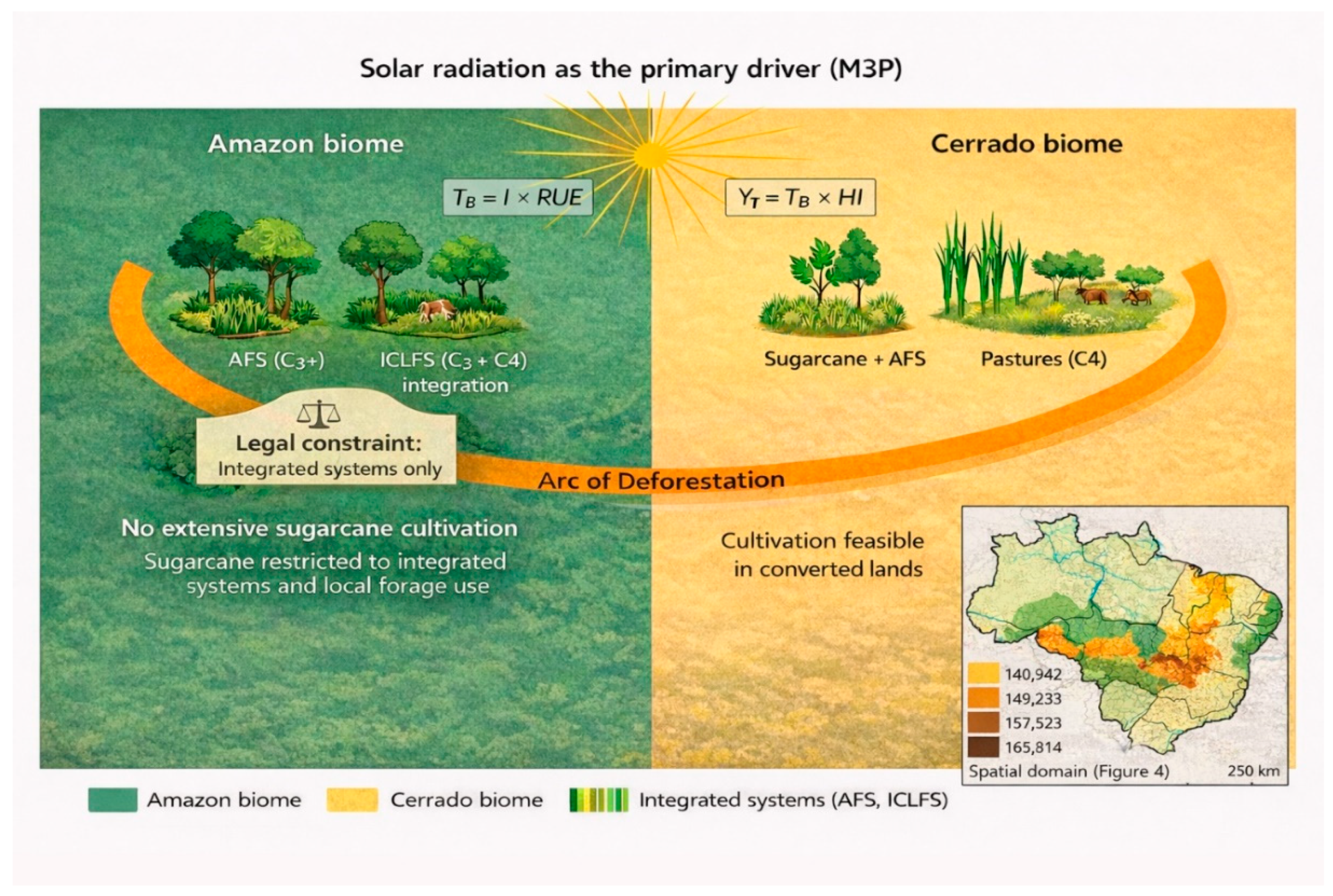 Finally, the representation of solar radiation in Figure 5 highlights its role as the fundamental energy source underlying the M3P framework. While radiation availability defines the upper physiological limits of sugarcane productivity, the realization of this potential depends on land-use governance, agronomic management, and institutional contexts. In this sense, the M3P model offers a scientifically grounded hypothesis that can be tested through technological demonstration units, experimental research, and strategic restoration initiatives. In Cerrado areas characterized by degraded pastures, sugarcane cultivation may represent a viable opportunity for productive land recovery. In contrast, within areas of the Amazon biome located in the Arc of Deforestation, the incorporation of sugarcane should be restricted to agroforestry and integrated systems, in accordance with Brazilian environmental legislation, contributing to income diversification and resilience of family-based rural agriculture rather than to extensive monoculture expansion.