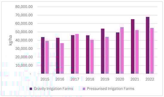 Table 3 summarises the characteristics of the two datasets derived from intersecting the SIGRIAN shapefile with the FADN sample. The difference in sample size between the gravity-fed and pressurised systems mirrors the actual distribution of irrigation types within the FADN data for the study area, as the dataset was used in its entirety without any filtering or restriction. As FADN constitutes the only harmonised source providing comparable plot-level economic information at the national scale, all available observations were retained for both irrigation systems.