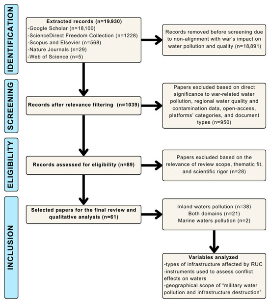 The initial search yielded 19,930 results (Google Scholar—18,100; ScienceDirect Freedom Collection—1228; Scopus and Elsevier—568; Nature Journals—29; Web of Science—5). These were reduced to 1039 publications based on relevance to war-related water pollution and quality. A second screening, applying filters for regional data, open access, categories, and document types, narrowed the selection to 89 works containing data on regional water quality and contamination. A final protocol-based review (relevance, thematic fit, and scientific rigor) resulted in 61 studies: 38 on inland water pollution, two on marine water pollution, and 21 covering both domains. The main variables analyzed were the types of infrastructure affected, the instruments used to assess impacts (geomatics, field observation, monitoring, sampling, analysis), and the geographical scope of what we termed “the military water pollution and infrastructure destruction”. The workflow (PRISMA methodology) is shown in Figure 2, and classification by water domain in Table 1. Although interconnected through river systems, inland and marine waters differ markedly in their characteristics, pollution sources, ecological dynamics, and management needs. Inland waters are primarily freshwater systems affected by agricultural runoff, sewage, and industrial discharges, with direct consequences for drinking water, irrigation, and local biodiversity. Marine waters, by contrast, are saltwater systems shaped by currents and tides, receiving both land-based inputs and direct sources such as shipping, offshore activities, and atmospheric deposition, with impacts on fisheries, climate regulation, and transboundary ecosystems. Importantly, under wartime conditions these pollution sources, pathways, and ecological characteristics are altered, intensifying pressures on both inland and marine environments and necessitating distinct yet interconnected management approaches.