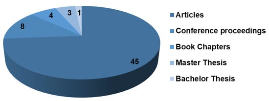As shown in Figure 3, most sources were peer-reviewed journal articles (45), followed by conference proceedings (8). The selection also included four master’s thesis, three book chapters, and one bachelor’s thesis, all providing relevant data. These works were analyzed after assessing their scientific rigor and quality, including methodology, transparency and replicability, coherence, logic, accurate reporting, sound argumentation, and rationale conclusions.