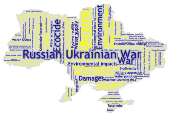 To explore recurring themes, a Word Cloud (Figure 5) was generated via https://www.wordclouds.com/, based on keywords from 59 of the 61 reviewed papers (291 terms total). The most frequent were Ukraine (10 mentions) and Russian Ukrainian War (10), reflecting the study’s context. War and Ecocide appeared six times each, while Environment was cited five times. Terms such as Black Sea, Kakhovka dam, Ecosystem services, Damages, Water resources and Pollution occurred four times. Environmental impacts, Ecology, Water supply, Military operations and Water infrastructures were each referenced three times. Other terms, including Russia, Reservoirs, Water pollution, Rivers and Water security, appeared twice.