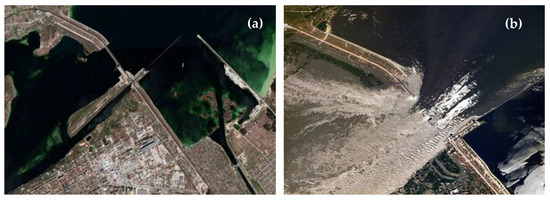 Satellite image of the Kakhovka Dam: (a) prior to its destruction (20 October 2020); (b) hours after its destruction (6 June 2023). Source of satellite image: Gleick et al., 2023 [73].
