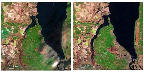 Flooding in the floodplain of the Irpin River on 11 March 2022 (left image) and 18 March 2022 (right image). Source of Sentinel-2 satellite images (spatial resolution of 10 m): Gleick et al., 2023 [73].