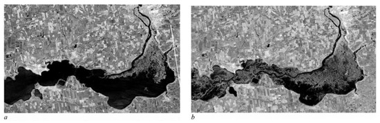 The floodplain of the lower Dnieper River: (a) before the destruction of the Kakhovka Dam, on 3 June 2023 (Sentinel-2 satellite image, spatial resolution of 10 m); (b) after the destruction of the dam, on 9 June 2023 (Landsat 9 satellite image, spatial resolution of 30 m). Images reproduced from Gleick et al., 2023 [73].