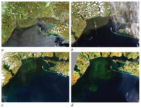 Pollution of the northwestern coastal area of the Black Sea, resulting from the movement of the post-Kakhovka pollution wave through the Dnieper River and the Dnieper–Bug Estuary. Satellite imagery sourced from Vyshnevskyi et al., 2023 [122], based on data from https://worldview.earthdata.nasa.gov (accessed on 30 September 2025). (a,b) and https://scihub.copernicus.eu (accessed on 30 September 2025) (c,d).