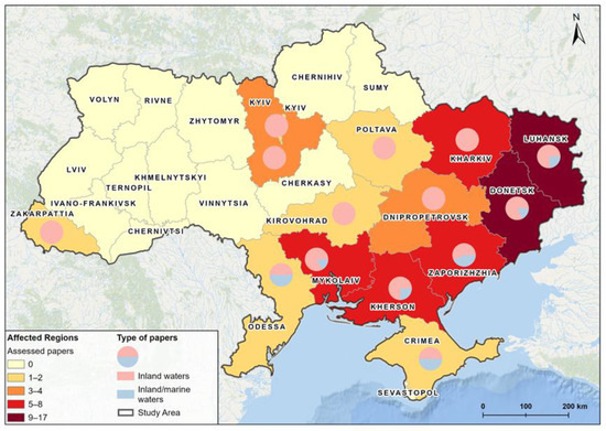 Special emphasis was placed on maps created with ArcGIS Pro, used in the following chapter to identify the number of papers per Ukrainian region affected by the war, along with the cities and contaminated water bodies mentioned in the selected studies.