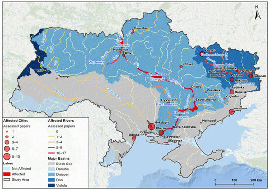- Afanasyev, S. Impact of War on Hydroecosystems of Ukraine: Conclusion of the First Year of the Full-Scale Invasion of Russia (a Review). Hydrobiol. J. 2023, 59, 3–16. [Google Scholar] [CrossRef]