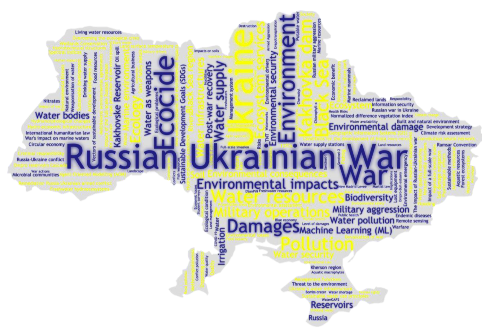 | 25. Hapich et al., 2024/1 [89] | Water infrastructures; Aquacide | Satellite imagery | Irpin River, Kakhovka, Oskil, Pechenizke, Karachu-nivske, and Karlivske Reservoirs, Raigorodskaya Dam, North Crimean Canal, Mykolaiv, Kharkiv, Mariupol, Chernihiv, Bakhmut, Severodonetsk, Vugledar, Lysychansk, Avdiivka |