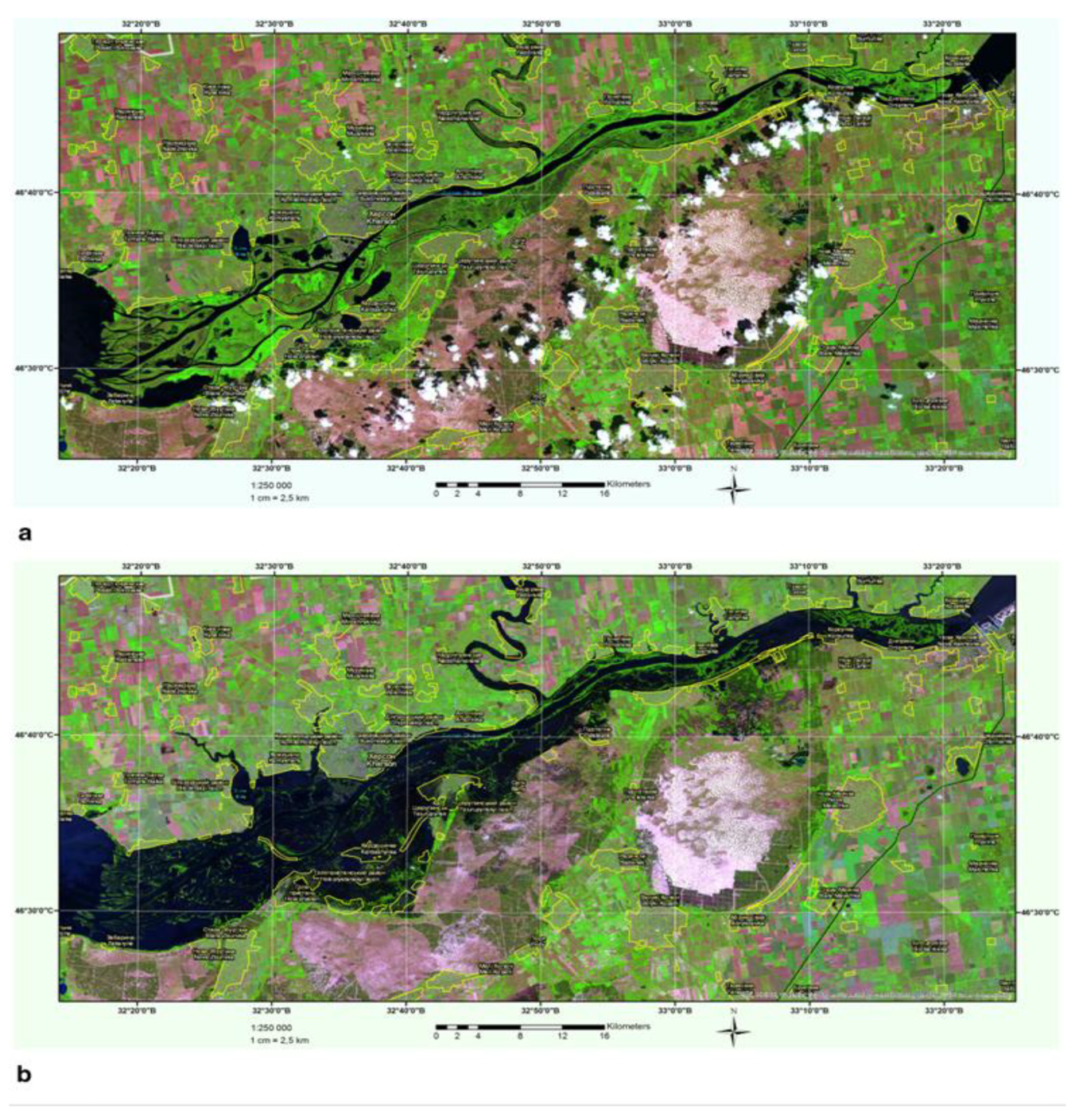 - Vlasova, O.; Shevchenko, A.; Shevchenko, I.; Kozytsky, O. Monitoring of Water Bodies and Reclaimed Lands Affected by Warfare Using Satellite Data. Land Reclam. Water Manag. 2023, 2, 59–68. [Google Scholar] [CrossRef]