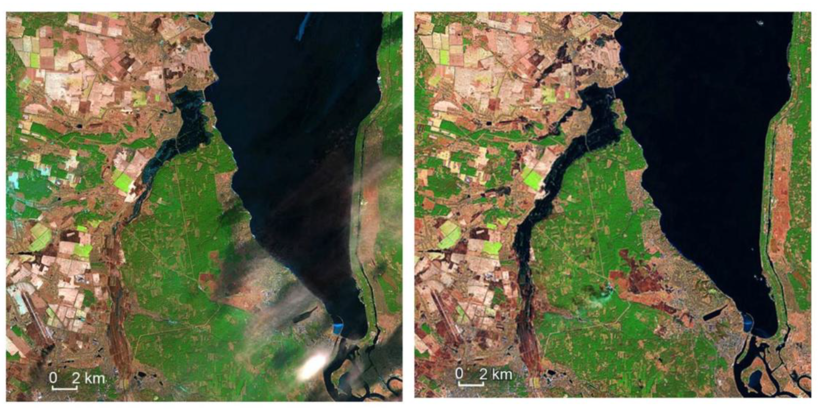 | 3. Algan and Aydoğan, 2023 [104] | Water infrastructures, industrial infrastructures | Satellite imagery | Zaporizhzhia, Dnipro River, Irpin River, The Black Sea |