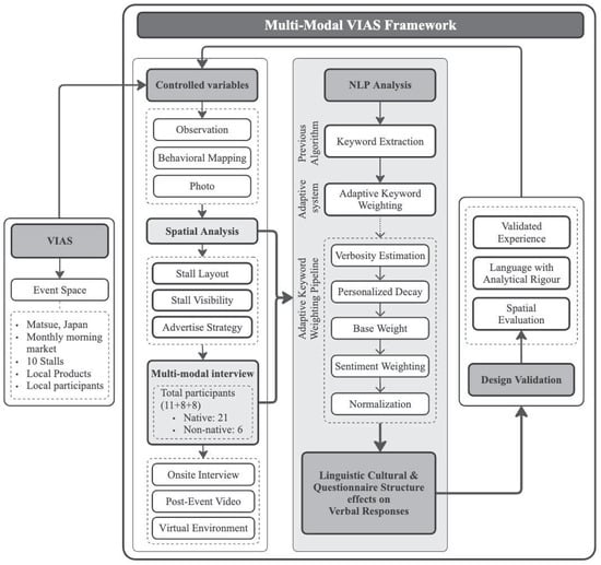 The remainder of this paper is structured as follows. Section 2 reviews foundational VIAS research addressing the designer-user perception gap, cross-cultural multi-modal elicitation methods, and emerging NLP-based approaches, highlighting opportunities and challenges motivating integrated behavioural-linguistic analysis. Section 3 presents the integrated multi-modal framework, detailing the Matsue event case study, behavioural observation methods, multi-phase interview design (onsite, video, virtual), culturally balanced dataset construction, and the VIAS multi-modal workflow linking spatial variables, behavioural data, and linguistic responses. Section 4 introduces the NLP-driven data interpretation framework, describing the baseline keyword weighting algorithm, identifying limitations (repetition bias, verbosity imbalance), presenting the adaptive per-participant model (personalised decay, sentiment coupling, normalisation), and demonstrating improved balance and interpretability. Section 5 examines linguistic proficiency and questionnaire structure effects through cross-modal validation, keyword diversity analysis, and cross-linguistic comparison, revealing cultural perception differences. Section 6 discusses architectural and spatial design implications, translating computational findings into evidence-based guidance by establishing validation loops, interpreting weighted priorities, deploying modality diagnostics, and translating sentiment-weighted keywords into concrete spatial strategies. Section 7 summarises principal findings and methodological contributions, highlights implications for cross-cultural perception research and AI-assisted evaluation, discusses framework limitations and transferability, and outlines future directions including multi-site deployment, behavioural-linguistic coupling, and integration with generative AI and immersive technologies.
