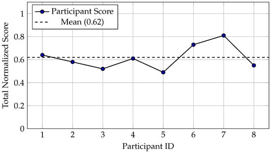 Per-participant total normalized scores across all categories (baseline algorithm). Participants 6 and 7 showed higher engagement, while Participant 5 contributed the least weighted content.