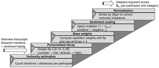 This section presents a comprehensive weighting methodology for analysing qualitative interview data extracted from the spatial perception study, incorporating sentiment-aware classification and adaptive weighting mechanisms. The full methodological workflow is illustrated in Figure 6. We begin with a baseline fixed-parameter algorithm that applies uniform decay rates and polarity coupling to mitigate repetition bias and avoid domination by frequently repeated terms. Decay rates refer to the parameter that determines how quickly the weight or influence of repeated keywords decreases with each additional occurrence, thereby preventing repetitive mentions from disproportionately affecting scoring. Polarity coupling refers to the mechanism that scales each keyword’s weight according to the sentiment polarity of the utterance. Strongly positive statements contribute full weight, neutral expressions contribute partial weight, and negative responses suppress or nullify credit, preventing misleading inflation from repeated but negative remarks. Analysis of initial results reveals verbosity imbalances where highly verbal participants disproportionately influence aggregate keyword distributions. Verbosity imbalance occurs when participants who produce longer and more frequent utterances receive disproportionately higher aggregate weights, not due to richer semantic content but simply because of their verbosity. This bias inflates scores for highly verbal individuals while underrepresenting concise speakers. To address these limitations, we introduce an adaptive per-participant weighting scheme that personalises decay rates based on individual verbosity patterns, incorporates sentiment modifiers, and normalises by utterance count. Utterance count refers to the total number of distinct spoken units produced by a participant during an interview. Normalising by utterance count prevents highly verbal individuals from disproportionately influencing aggregate keyword weights. Comparative evaluation demonstrates that the adaptive approach achieves a more balanced representation across diverse communication styles while maintaining methodological transparency and interpretability.