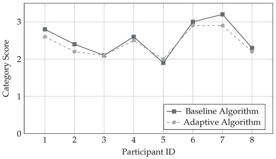 Figure 8 shows substantial variability across participants under the baseline algorithm. Participant 7 (married with children) achieved the highest total normalized score (0.81), contributing extensive weighted content across all categories. In contrast, Participant 5 contributed the least (0.49), reflecting shorter responses and more neutral or negative sentiment. The mean normalized score across all participants was 0.62, indicating moderately high engagement overall.