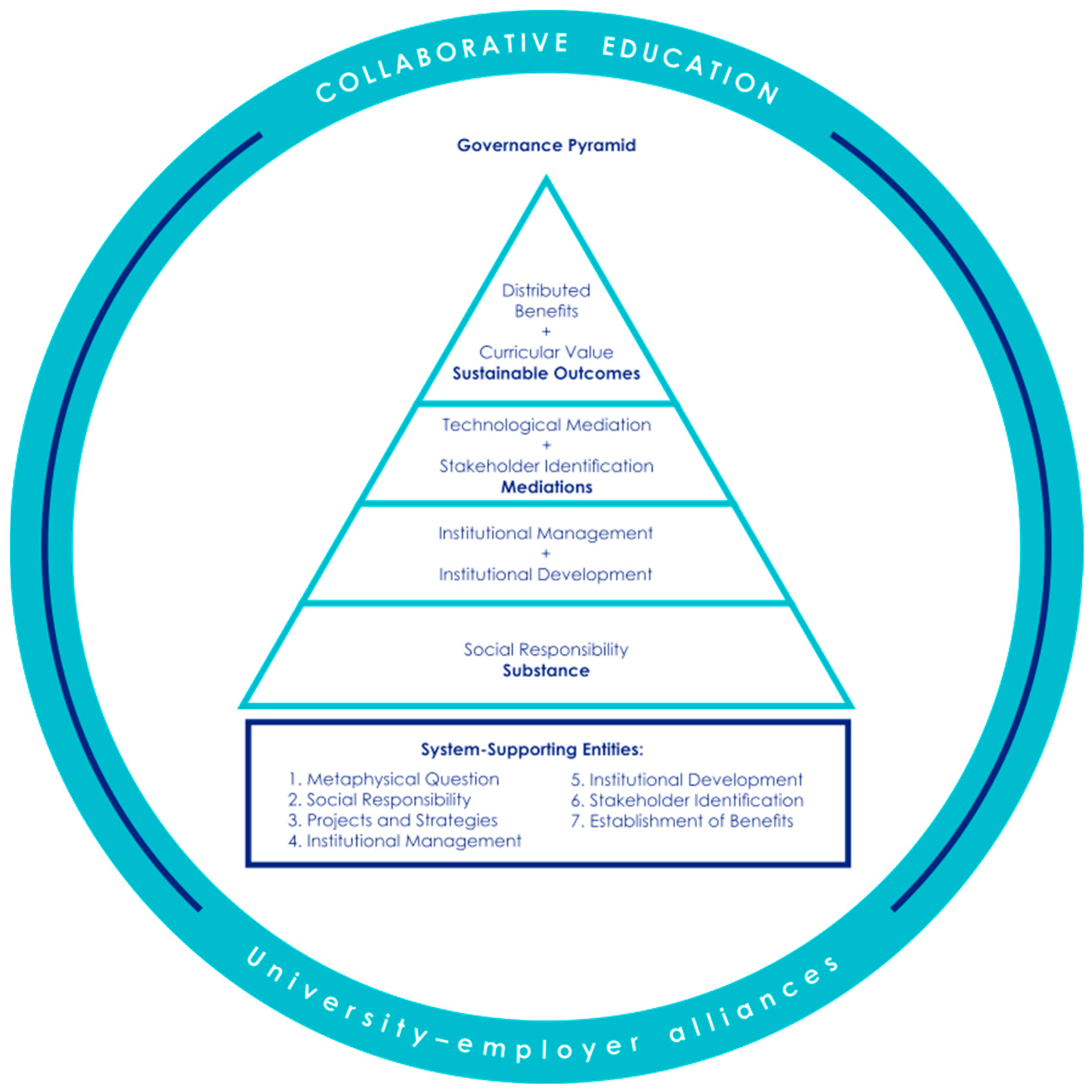 To turn Collaborative Education into a governable object, this article proposes a minimum architecture of seven entities: (1) Metaphysical question; (2) Social Responsibility; (3) Projects and strategies; (4) Institutional management; (5) Institutional development; (6) Stakeholder identification; and (7) Establishment of benefits. This architecture makes it possible to order ends and means, assign responsibilities, and audit coherence without relying on field data collection.
