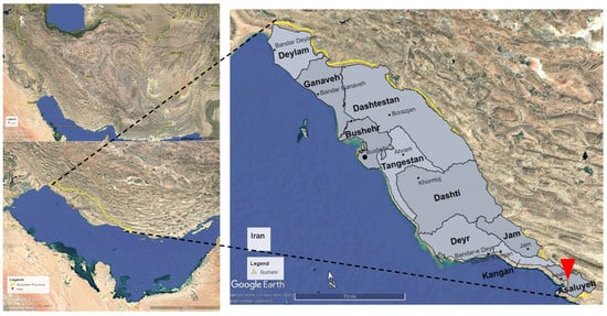 (Left up) Location of Islamic Republic of Iran; (Left down) Location of Bushehr Province (yellow polygon) and (Right) Asaluyeh City (red triangle). Source: Satellite image © 2025 Google Earth.