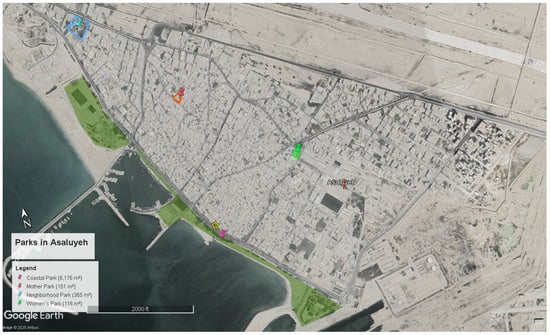 Systematic analysis of satellite imagery, Google Earth Pro (2024), combined with municipal cartographic data and field reconnaissance identified four discrete public green spaces within Asaluyeh’s urban boundary (Figure 3). These facilities collectively constitute the city’s entire public park infrastructure. Mother Park (151 m2) serves as a specialized facility for early childhood recreation. Located within a central residential district, this compact park targets toddlers and young children under eight years of age. Women’s Park (118 m2) functions as a gender-segregated facility accommodating Islamic cultural norms. Situated in a peripheral location to enhance privacy, this park provides a designated environment where women can engage in outdoor recreation. Neighborhood Park (365 m2) represents the most recently developed municipal facility, located within the northwestern residential zone. This local-scale park serves adjacent residential blocks. Coastal Park (6176 m2) constitutes Asaluyeh’s primary multifunctional recreational facility. As the city’s largest park, representing 91% of total municipal park area, and the only waterfront green space, Coastal Park offers diverse activity zones.