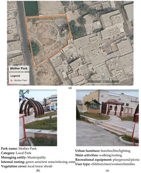 Mother Park. (a) Location Map, (b,c) general view of the park; Photo credit: author, 15 April 2025.