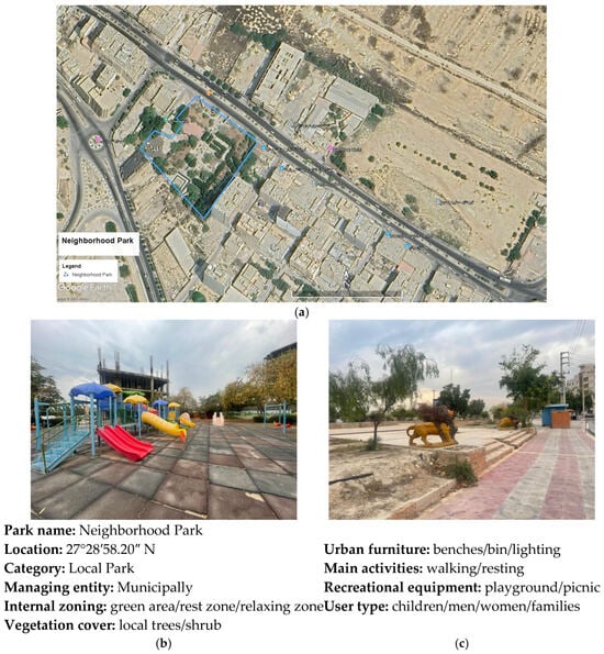 Neighborhood Park. (a) Location Map, (b,c) general view of the park; Photo credit: author, 15 April 2024.