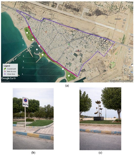 Coastal Park. (a) Location Map, (b,c) left and right; general view of Coastal Park; Photo credit: author, 15 April 2024.