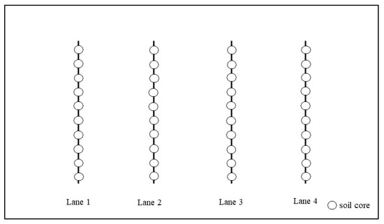 Soil samples were collected from five sites formerly under tobacco cultivation in Ontario. Five trips of soil sampling were conducted from May to August in 2017. Approximately 40 soil cores were taken from each site, as demonstrated in Figure 1. The sampling site was divided into four lanes symmetrically (Lane 1–Lane 4), and ten cores were taken from each lane at equal distance. All soil cores were collected at 12-inches depth by a tubular soil sampler. The collected soil cores were manually mixed, and then kept in clean zipper bags to transport to the laboratory at the University of Guelph. During transportation, the samples were stored in a cooler, at a temperature below 8 °C, to avoid potential volatilization. The samples were stored in a refrigerator (2–4 °C) before analyses. Samples were analyzed within three weeks after collection. The collected soil samples were characterized for pH, organic matter, and physical classification by the Agricultural and Food Laboratory at the University of Guelph.