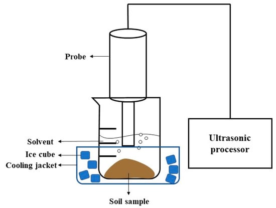 Homogenized extraction is a conventional method for pesticide extraction, and it is considered to be less efficient, since it works by diffusion with no physical acceleration [16]. Ultrasonic bath extraction is another common method used for OCPs extraction [24,25,26], and has been demonstrated to have higher efficiency on extracting OCPs from soil samples [10]. Therefore, the ultrasonic bath extraction was also selected to be the starting point of the process intensification on the extraction step. Ultrasonic probe extraction is a less-studied method, compared with the ultrasonic bath, in the development of extraction methodology for pesticide detection. Available studies of its application mostly relate to extracting analytes from biological samples, and there is limited data on its extraction yield of pesticides from soil samples [27,28,29]. Accordingly, the extraction process was intensified by comparing the extraction performance of these three techniques, and determining the co-extraction effects.