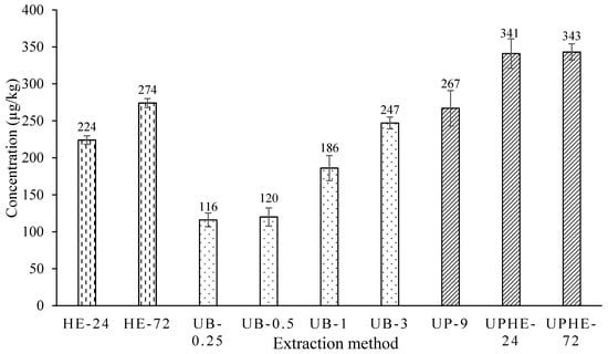 Sampled soil from Site 4 was used for extraction method intensification. Three techniques corresponded to nine conditions: homogenized extraction for 24 h (HE-24), homogenized extraction for 72 h (HE-72), ultrasonic water bath extraction for 0.25 h (UB-0.25), ultrasonic water bath extraction for 0.5 h (UB-0.5), ultrasonic water bath extraction for one hour (UB-1), ultrasonic water bath extraction for three hours (UB-3), ultrasonic probe extraction for nine minutes (UP-9), ultrasonic probe extraction for nine minutes plus 24 h of homogenized extraction (UPHE-24), and ultrasonic probe extraction for nine minutes plus 72 h of homogenized extraction (UPHE-72). The extracts were then processed by rotary evaporator concentration and GC-MS analysis, and the extracted concentrations were determined. The yield of DDTs from soil by each extraction method is demonstrated in Figure 4.