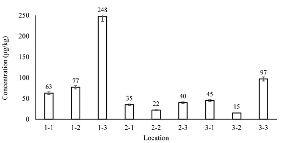 Grid soil sampling was performed at Site 4 to examine the accuracy and reliability of the further DDTs concentration determination. This sampling method is commonly used for crop nutrient management and site assessment [13]. The grid sampling results are demonstrated in Figure 5. The 95% confidence interval of DDTs concentration in Site 4 was between 25.90 µg/kg to 78.60 µg/kg, according to the Shapiro–Wilk test result. Furthermore, the DDTs concentration in location 1–3 appeared to be higher than the rest of the data, at 248 µg/kg, which implicates that hotspots may exit in sampling sites. The variability could be caused by complicating factors such as cultivation, translocation, and heterogeneous pesticide spray. Enough samples should be collected from each sampling site to minimize the variability and to increase the representativeness of samples.