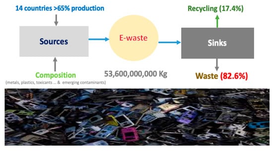 Developed countries such as Japan and in the European Union, and North America have the potential and infrastructure to recycle e-waste [7]; however, a significant amount of e-waste is legally or illegally transported to low-income countries having lax or no regulation for e-waste [8]. This shipment of the waste is motivated by strict e-waste policies and higher cost to recycle hazardous substances in developed countries than the cost to ship them to developing nations. The Global E-waste monitor 2020 reports that formally collected/recycled e-waste increased by 1.8 Mt since 2014 to reach ~17.4% in 2019. The whereabouts of the remaining waste is largely unaccounted for—apparently, this was illegally traded, incinerated, or dumped in landfills [3]. Figure 1 shows a schematic representation of generated, recycled, and undocumented e-waste recorded worldwide in 2019. Some developing countries such as India have recently started to impose e-waste rules, with tepid results. Although 71% of the global population is covered by the e-waste policies and legislation, their proper implementation is yet to be achieved [3] rendering informal sectors, mostly in developing countries, to handle e-waste with little or no safety precautions and knowledge and putting both the environment and public health at serious risk [9,10,11].