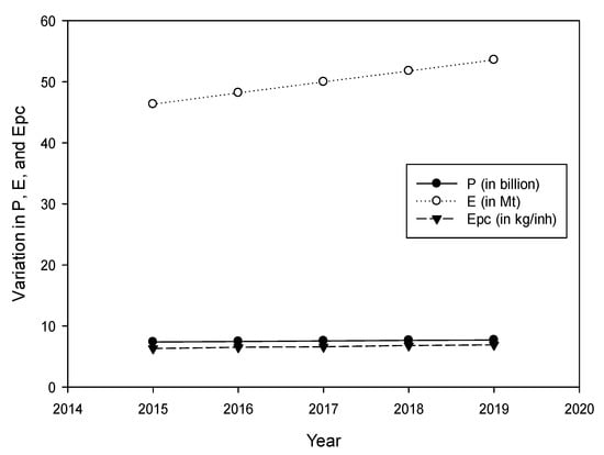 Variation of the global population, e-waste generation, and e-waste per capita between 2015 and 2019. P, E, and Epc denote population, e-waste, and e-waste generated per capita. Source of P [32]. Global e-waste for a particular year is obtained by adding e-wastes of all the continents for the very year taken from the source [33]. Note that the error bars are not included, as the exact estimates were not presented systematically for all data. However, we raise the caveat that the minor variation can be within the margin of errors.