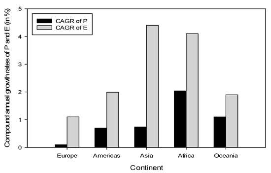 Compound annual growth rates of population and e-waste generation of five continents from 2015 to 2019. Sources of E and P [32,33].