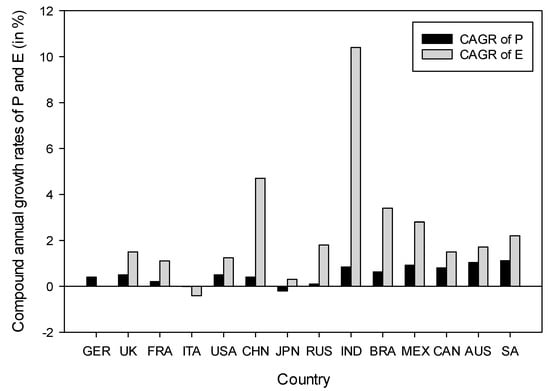Compound annual growth rates of population and e-waste of different countries between 2015 and 2019. Sources of E and P [32,33].
