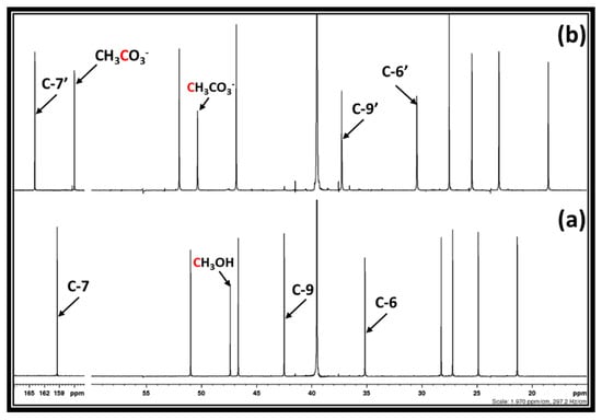 13C NMR for the synthesis of [DBUH] [CH3CO3] from DBU, methanol, and CO2 in DMSO. (a) DBU and CH3OH, and (b) [DBUH] [CH3CO3] (NMR analysis with D2O capillary).