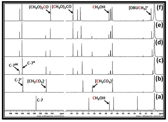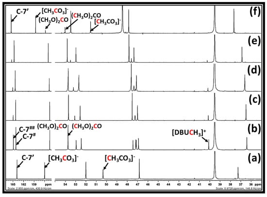 13C NMR for the synthesis of DMC from [DBUH] [CH3CO3] and CH3I in DMSO. (a) DBU and methanol, (b) [DBUH] [CH3CO3], reaction mixture after addition of (c) 0.25, (d) 0.50, (e) 0.75, and (f) 1 equivalents of CH3I in DMSO solution of [DBUH] [CH3CO3] (NMR analysis with D2O capillary).