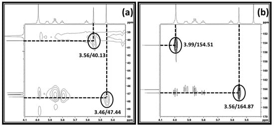 As shown in Figure 3, after addition of different equivalents of CH3I to the reaction mixture, the peaks belonging to the methyl group and carbonyl carbon in the [CH3CO3]− anion, at the chemical shifts 30.45 and 155.98 ppm, respectively, steadily decreased. On the other hand, new peaks appeared at the chemical shifts 40.09, 47.44, 53.74, 154.51, 164.15, and 164.87 ppm, respectively, whereby the intensities of these peaks increased with increasing amounts of CH3I. As observed during the synthesis of SIL, the peak with the chemical shift 47.44 ppm is related to the methyl group of methanol. Further, after comparing the NMR spectra of both reaction mixtures (with addition of 1 eq. CH3I) and commercially available DMC, signals at 53.74 and 154.51 ppm, respectively, belonging to the carbon atoms in CH3- and carbonyl group of the DMC were observed (Figure S2). Hence, as mentioned in the proposed reaction Scheme 1, it is possible to synthesize DMC after the synthesis of SIL followed by its equivalent interaction with CH3I. 1H NMR spectra of the reaction mixture also confirmed the formation of DMC in the reaction mixture. Similar to the case of 13C NMR analysis, upon an increase in the amount of CH3I, the amount of DMC steadily increased (Figures S3 and S4). Simultaneously, the peak intensity for the free protons of the methyl group in methanol, at 3.45 ppm, along with an unknown signal at 3.55 ppm, also increased in the reaction mixture upon increasing the amount of CH3I. In order to identify the unknown peaks in both 1H and 13C NMR, as well as to gain insights into the formation of methanol in the reaction mixture, two-dimensional NMR (2D NMR) analysis of the reaction mixture was carried out further.
