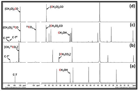 Further, in order to confirm that the captured CO2 during SIL synthesis became a part of DMC, labeled CO2 (i.e., 13C-enriched CO2 (tracer technique)) was used during the two-step DMC synthesis process. The existence of 13C-enriched CO2 in SIL as well as DMC was further confirmed by 13C NMR and HMBC analyses, respectively. As shown in Figure 5b, SIL formed after the reaction of DBU and methanol with 13C-enriched CO2, and the high-intensity peak for the carbonyl carbon in [CH3CO3]− anion was observed at the chemical shift of 154.56 ppm. After an addition of CH3I in the DMSO solution of SIL, the high-intensity peak for the carbonyl carbon atom in DMC was observed, and this was further confirmed with the help of 13C NMR of the commercially available DMC (Figure 5c,d). Being 13C-enriched, the intensities of the peaks for the carbonyl carbon atoms in both [CH3CO3]− and DMC were found significantly higher than the corresponding intensities of the C-7’, C-7#, and C-7## in DBU cations formed in the reaction mixture. On the other hand, as shown in Figure 3, the intensity of the peak for the carbonyl carbon was comparable with the intensities of these sp2-hybridized carbons in the DBU cation when no 13C-enriched CO2 was used. Further, HMBC analysis also revealed that a correlation peak was observed for the protons of the methyl group and 13C-enriched carbonyl carbon atom in DMC (Figure S6a). In addition, due to having a 13C-enriched carbon atom, the doublet peak was observed for the protons for the methyl group in DMC, whereas when no 13C-enriched CO2 was used, a singlet peak was observed for these protons (Figure S6b) [29]. Therefore, these above-mentioned NMR analysis studies revealed that the 13C-enriched CO2 became a part of DMC formed after the reaction of 13CO2 enriched SIL with CH3I. Hence, it can be concluded that DMC can be synthesized from CO2 following a two-step synthetic approach, mentioned in the reaction Scheme 1.