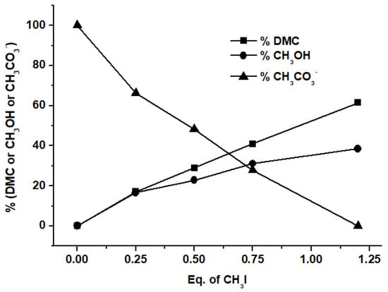 Amounts (%) of DMC, CH3OH, and CH3CO3− anions in the reaction mixture after addition of different amounts of CH3I.