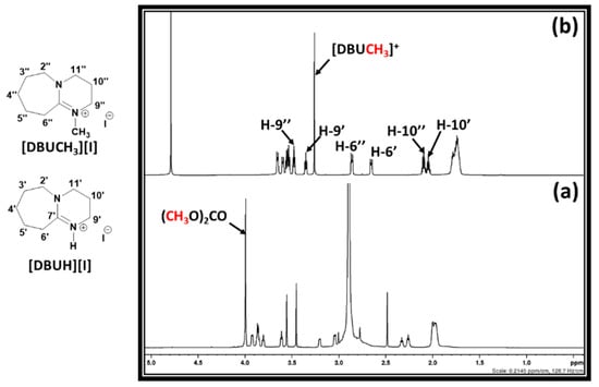 1H NMR spectra (a) reaction mixture with 1 eq. CH3I added (NMR analysis with capillary filled with D2O), and (b) mixture of DBU salts, i.e., [DBUH] [I] and [DBHCH3] [I] (NMR analysis with D2O).