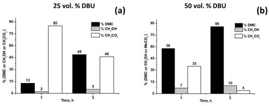 Amounts of DMC, methanol, and CH3CO3− anions formed in the reaction mixture with (a) 25 vol.% of DBU and (b) 50 vol.% of DBU in alcoholic solution; 3 eq. of CH3I were added.