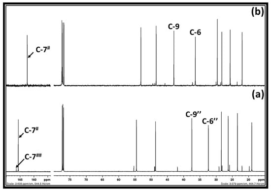 13C NMR spectra for (a) reaction mixture obtained where 50 vol.% of DBU and 3 equivalents of CH3I were used for DMC synthesis in 10 h reaction period (NMR analysis with D2O capillary). (b) DBU salts separated from reaction mixtures with the use of ethyl acetate (NMR analysis with D2O).